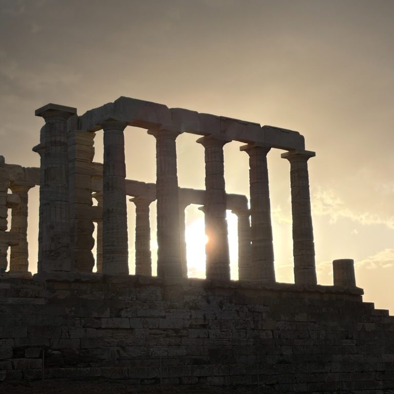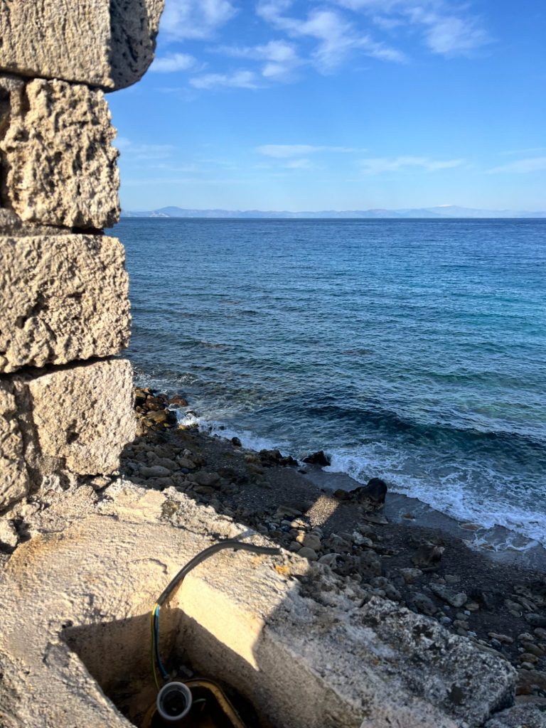 Having done the group presentation on Cape Sounion I had some meaningful historical context for the site. I could see myself being an Athenian lookout in 400 BCE monitoring the Aegean Sea, it’s an incredible view. On a clear day, you can see a radius of about 15 miles. What remains of the Temple of Poseidon stands as the centerpiece to this awesome jut of land. Visitors are not welcome to actually go in or right up to the temple, but marveling at the architectural prowess that it is from below feels appropriate. There are, what I suspect, are some pieces of it scattered on the ground slightly downhill from it. I noticed a chunk of stone with a square cut out of the center. The columns on the temple are connected with a cube of wood set into the stone.