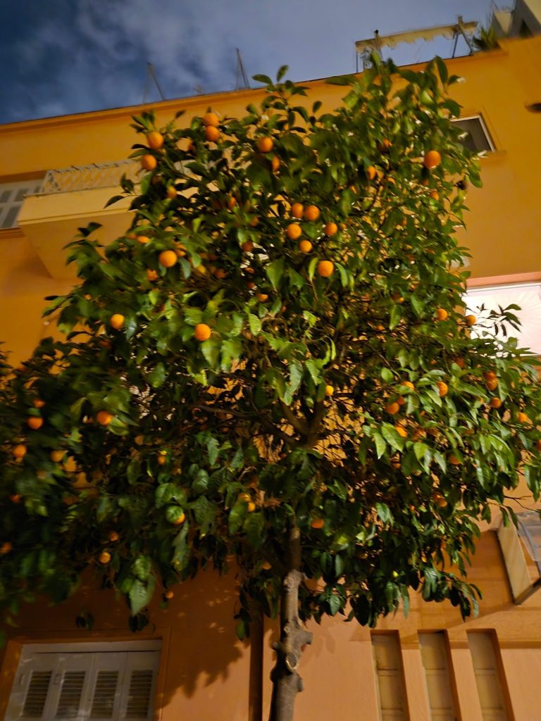 The narrow alleyways were filled with all the classic smells and sounds one might expect from an urban center; food grilling, diners chatting, and birds cawing. Beneath it all were unfamiliar sights as well, though; oranges littering the ground beneath the trees lining the roads,