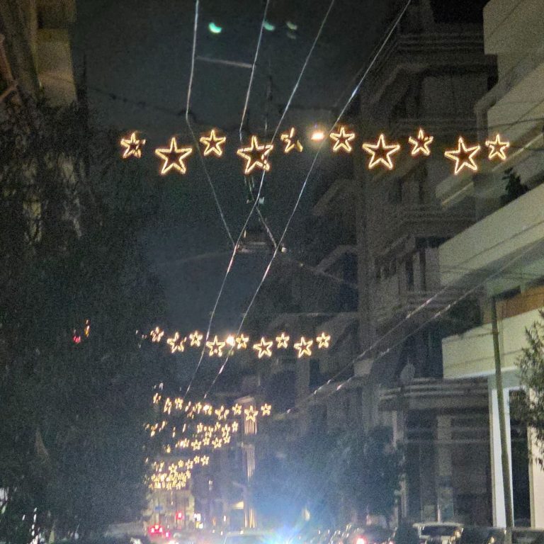 We were going to try to go to a clothing store, since we still didn’t have our luggage, but the stores were unfortunately closed. We decided to head back to our apartments and I was beat (again, 4 hours of sleep) so I took a long nap. When I woke up, I wanted to take a shower, but I didn’t have any body wash, so I ventured to the store once more. It’s been a bit of a challenge getting used to walking around Athens, as most cities are confusing to walk around when you are new, but there are a lot of pretty sites. Most holiday decorations are still up, and there are these cute star-shaped lights that are on many street lamps. Having extra light really helps when navigating.