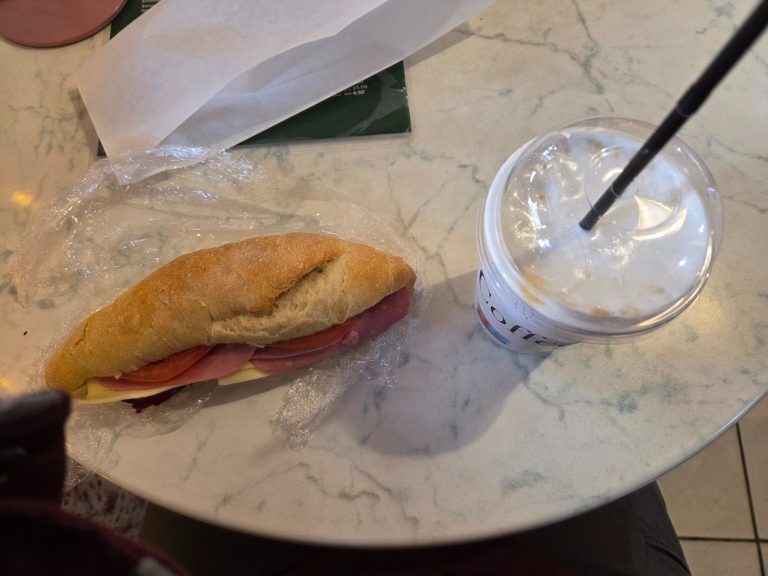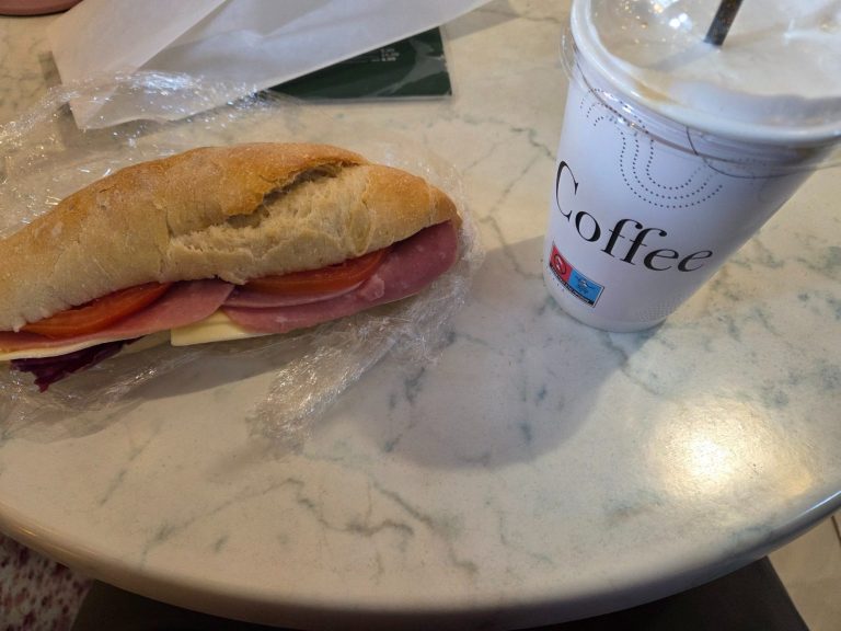 Which brings me to my current meal (which I'm eating while typing): A ham and cheese sandwich and an espresso freddo. While these are things I have back home (the espresso is 2 shots of espresso with milk and cream on top with added sugar) it differs taste wise.