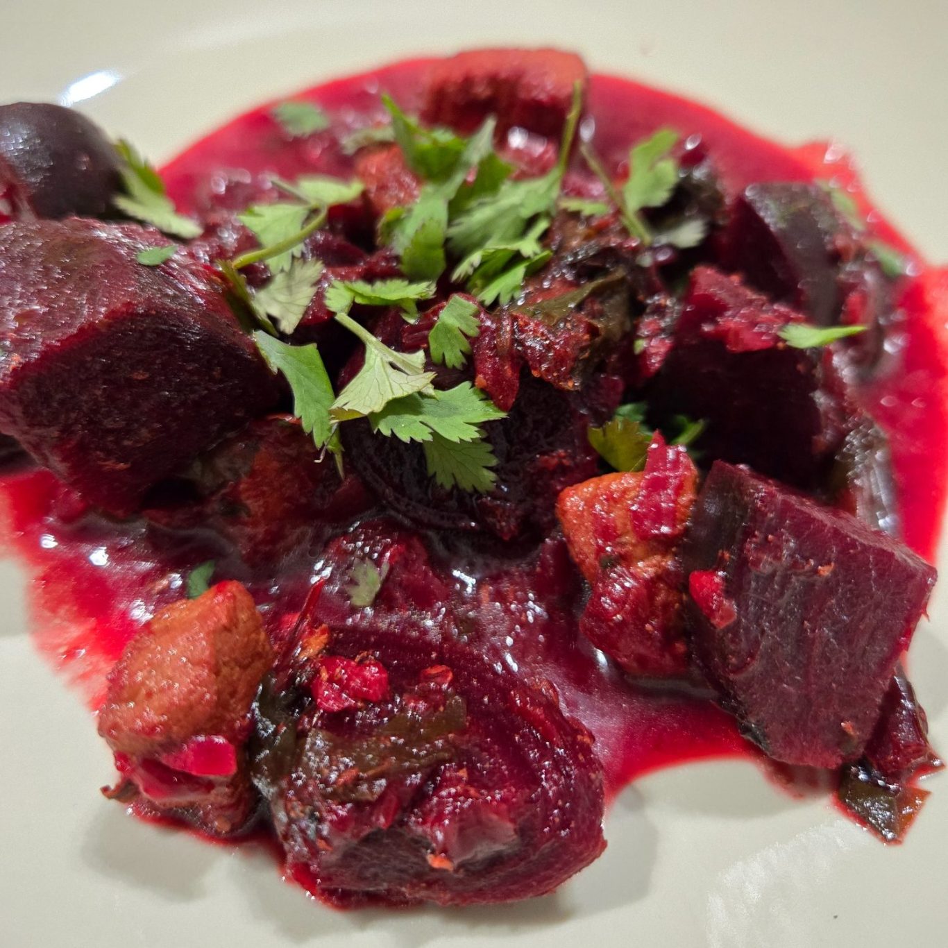 From the moment we heard about Tuh’u during our first class, my roommates and I were hooked on the idea of recreating this stew. Or at least attempting to. It felt fitting to recreate. We’d only just arrived in a new, foreign land, we’d begun our first days of study, and we were all very hungry and tired due to the loss of our checked baggage. What better pick-me-up than a hearty stew dyed red with beets?