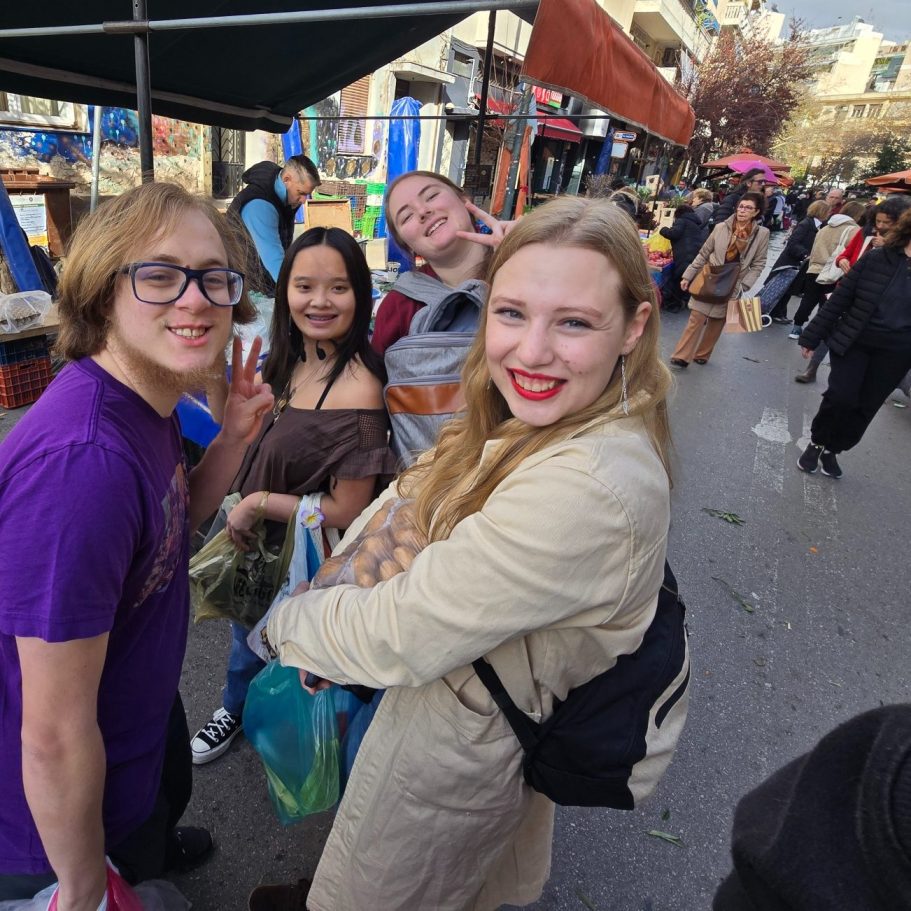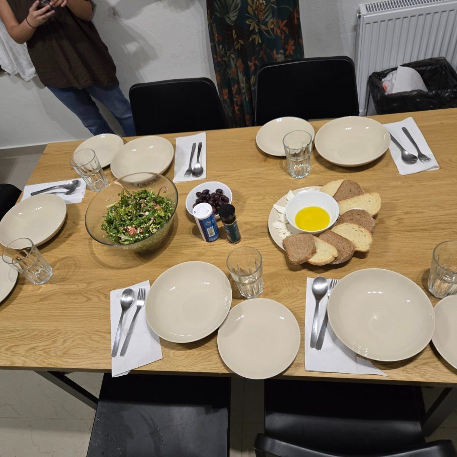 After inviting a few of our other classmates for a meal, we stopped by the local farmer’s market to acquire our ingredients. When the day arrived, our intrepid Head Chef Makenzie set about reviewing the video Professor Finitsis shared, and swiftly dolled out orders to our small kitchen crew. Dicing Expert Leann handled the prepping of ingredients, while I became Wash Master Jaquie and took care of busy work, pesky onions, and washing vegetables including our (accidentally acquired) 1kg of arugula. We had a salad to go with dinner.